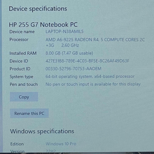 HP Laptop 255 G7 15.6" A6-9225 2.6GHz 8GB RAM 256GB SSD